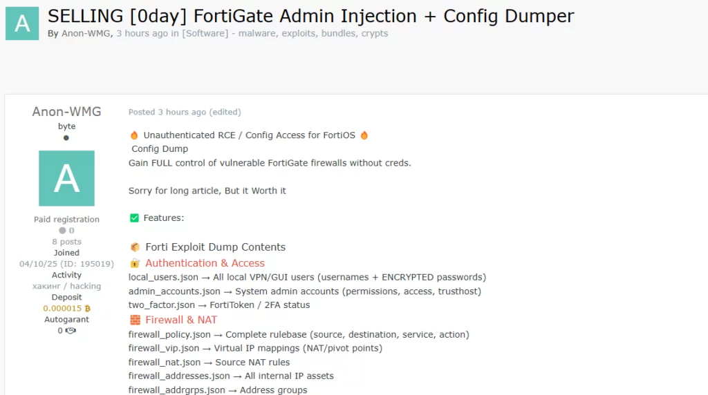 Un utente anonimo ha pubblicato nel forum underground chiuso Exploit un annuncio che ha subito attirato l’attenzione della comunità di cybersecurity: la vendita di un exploit zero-day per firewall Fortinet, che permetterebbe l’accesso completo e non autenticato ai dispositivi vulnerabili.