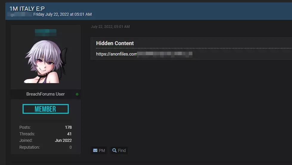 Qualche giorno fa, sul noto forum underground Breach Forums, è comparso un post di un utente che metteva liberamente scaricabili una combo (account e password) di un milione di account Italiani.