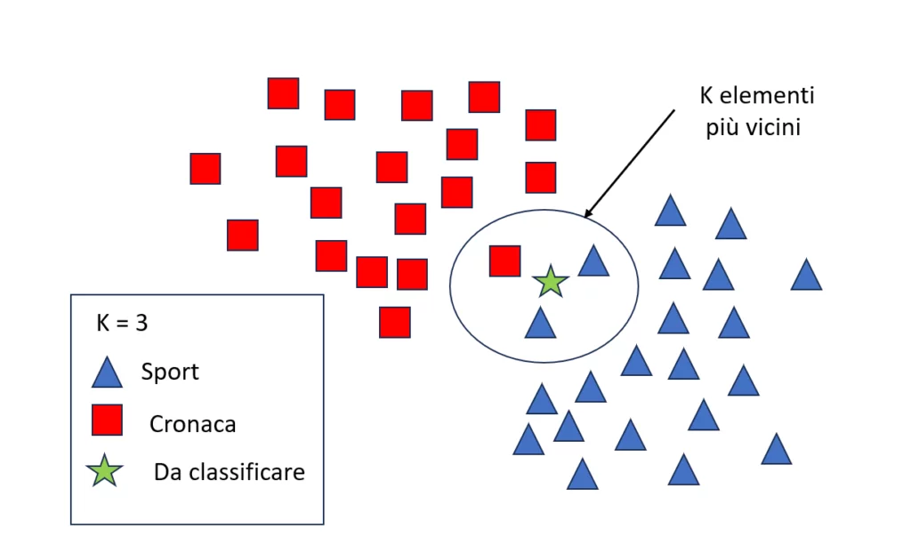 In questo esempio, il nuovo elemento da classificare è assegnato alla classe sport, dato che tra i 3 elementi più vicini è la classe maggiormente rappresentata. Come si può intuire, il kNN è tra gli algoritmi più semplici del Machine Learning. Questo algoritmo, inoltre, non ha bisogno di una vera fase di addestramento.