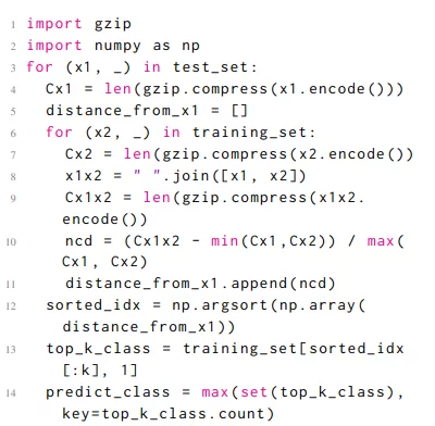 La semplicità dell’algoritmo proposto si basa su gzip, un compressore loss-less di dati, una misura di distanza e un classificatore kNN. L’idea è utilizzare il compressore per individuare i pattern regolari nel testo e tradurli in punteggi di similarità utilizzando la metrica di distanza.