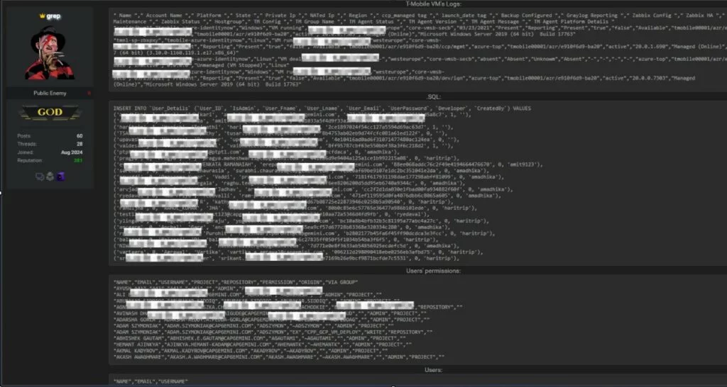 Tra i dati esposti vi sarebbero database contenenti informazioni sugli utenti, permessi, e log delle macchine virtuali utilizzate da T-Mobile, uno dei principali clienti di Capgemini.