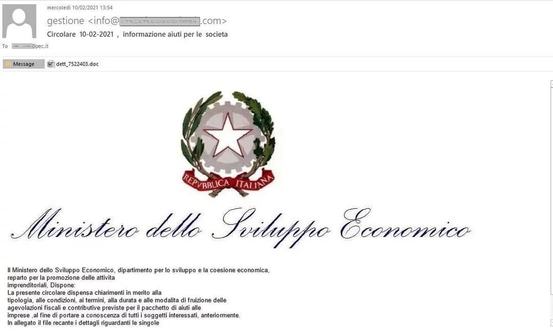 Una nuova campagna di #malspam si sta diffondendo attraverso una falsa e-mail del Ministero dello Sviluppo Economico (#MISE), con riferimenti ad #agevolazioni #fiscali e aiuti alle imprese con oggetto “Circolare 10-feb-2021”.