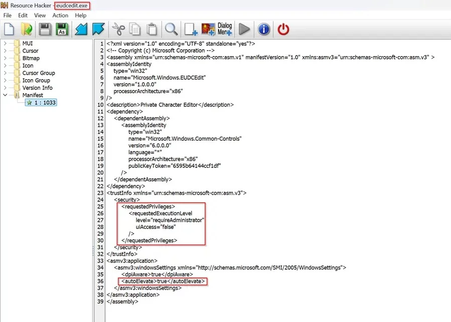 La falla di sicurezza è causata da impostazioni critiche integrate nel manifest dell’applicazione eudcedit.exe. Questa vulnerabilità è generata da due particolari tag di metadati. Questa combinazione si rivela particolarmente pericolosa. Quando UAC è configurato con impostazioni permissive come “Eleva senza chiedere conferma”, Windows eleva automaticamente eudcedit.exe da un livello di integrità medio ad uno alto senza visualizzare alcun avviso di sicurezza, ha affermato Bahar .