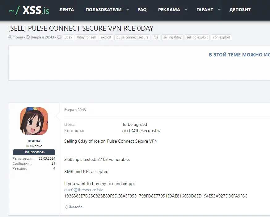 Recentemente, è emerso all’interno del noto forum underground XSS, la messa in vendita di uno zero-day RCE. Tale bug di sicurezza di tipo Remote Code Execution (RCE) affligge gli apparati Pulse Connect Secure VPN, di Ivanti.