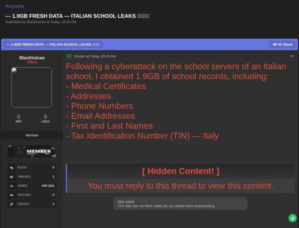 Un presunto data leak di circa 1.9GB, attribuito ad una scuola italiana, è stato pubblicato su un forum underground dall'utente BlackVulcan. Il contenuto, è nascosto e accessibile tramite interazione all'interno del forum. Se autentici, i dati potrebbero alimentare campagne di phishing e frodi mirate, inoltre, quando dati di questo tipo coinvolgono i più piccoli, il problema più grave è la persistenza del dato che una volta fuori, è fuori per sempre.