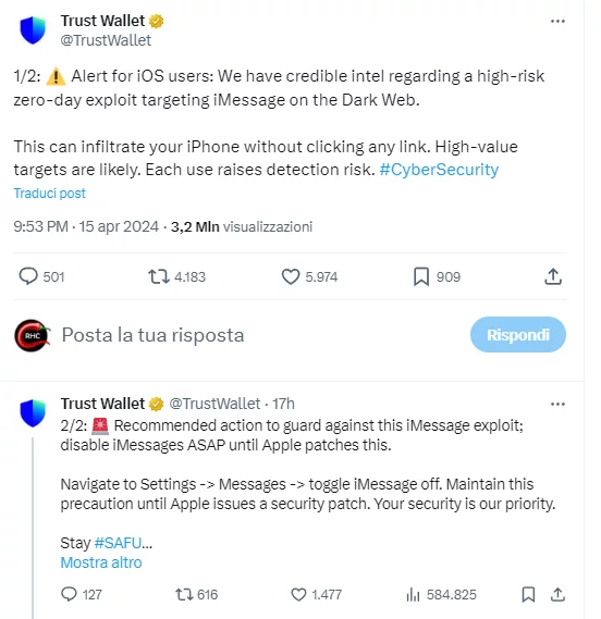 Trust Wallet ha invitato gli utenti Apple a disabilitare iMessage a causa delle informazioni su una vulnerabilità critica zero-day che consente agli hacker di prendere il controllo degli smartphone.