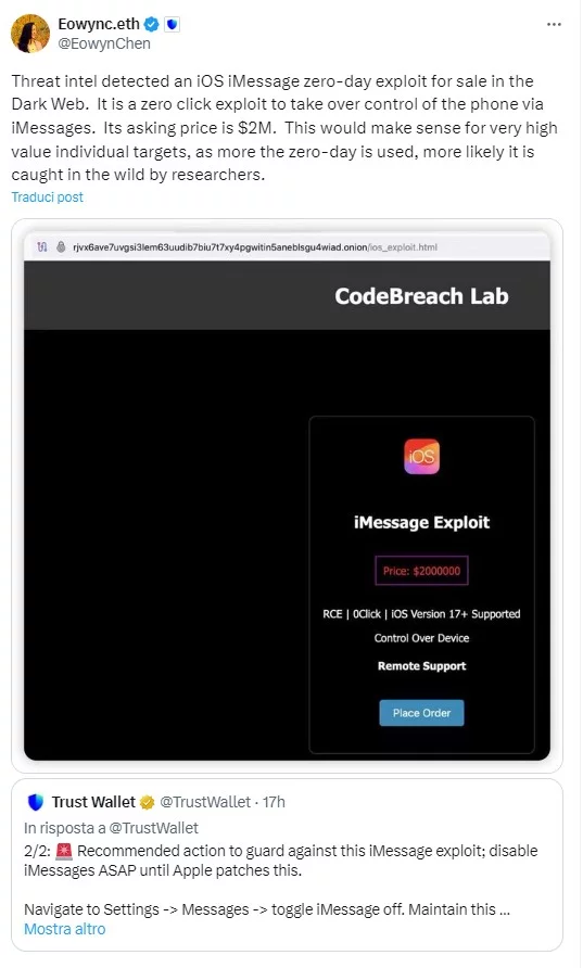 La direttrice di Trust Wallet, Eowyn Chen, ha condiviso uno screenshot che secondo lei mostra un exploit venduto per 2 milioni di dollari sul dark web.