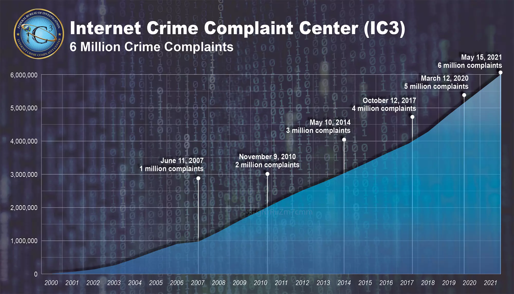 Ci sono voluti quasi sette anni perché l’Internet Crime Complaint Center (IC3) dell’FBI registrasse il suo primo milione di denunce (dal 2000 al 2007). Ma ci sono voluti solo 14 mesi per aggiungere il suo ultimo milione ai 6 totali.