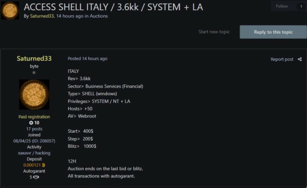 Secondo quanto riportato dagli analisti di Paragon Sec alla redazione di Red Hot Cyber, un pericoloso threat actor ha messo all’asta nel celebre forum underground chiuso Exploit l’accesso abusivo a una vasta infrastruttura informatica situata in Italia.
