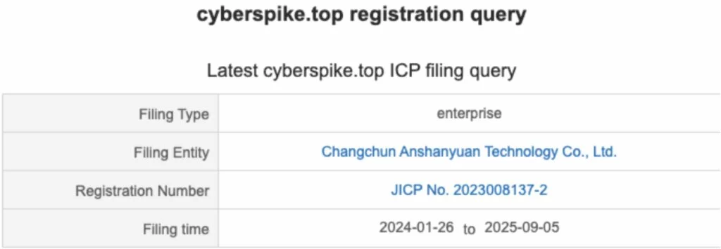 Cyberspike, riportano i ricercatori di Striker, emerge per la prima volta il 27 novembre 2023, con la registrazione del dominio cyberspike[.]top associato alla Changchun Anshanyuan Technology Co., Ltd., società cinese indicata come fornitore di soluzioni AI e software applicativo.