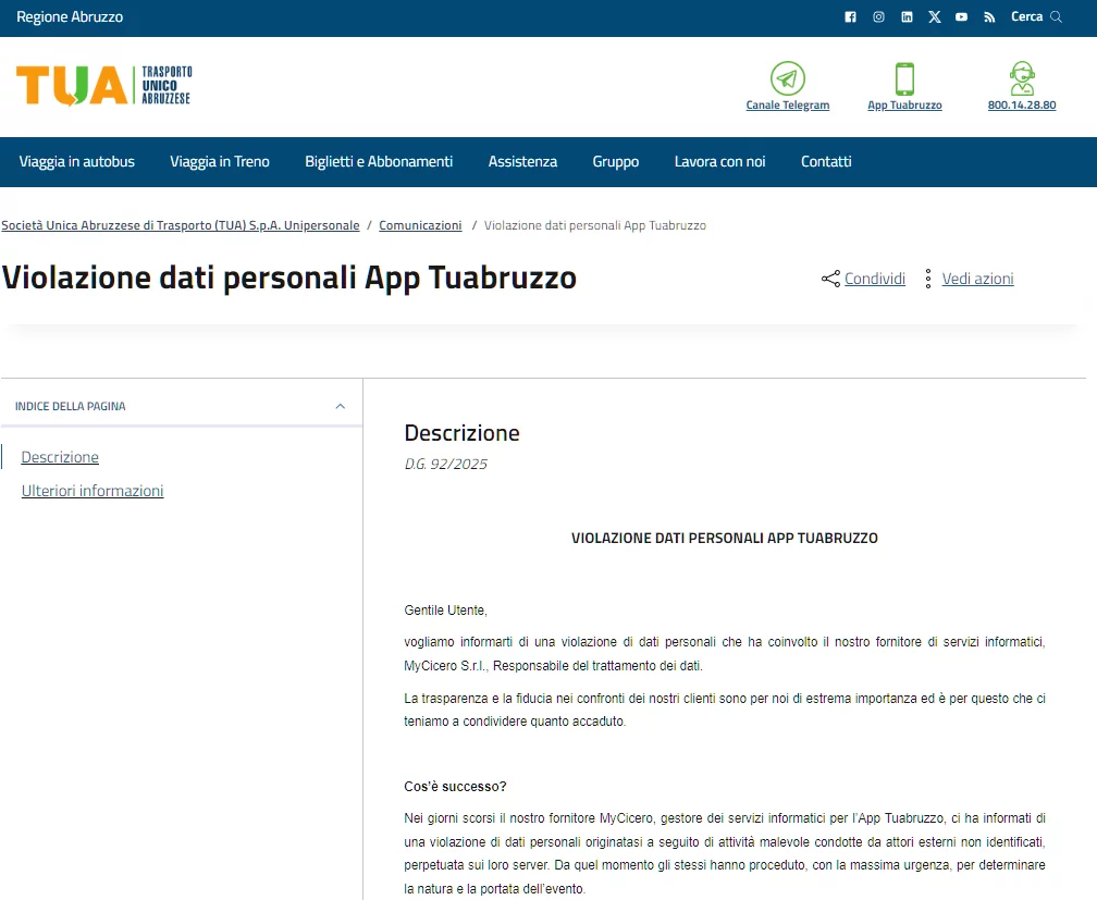 Tuabruzzo informa i propri utenti di una recente violazione di dati personali che ha coinvolto il fornitore di servizi informatici MyCicero S.r.l., incaricato come Responsabile del trattamento dei dati.