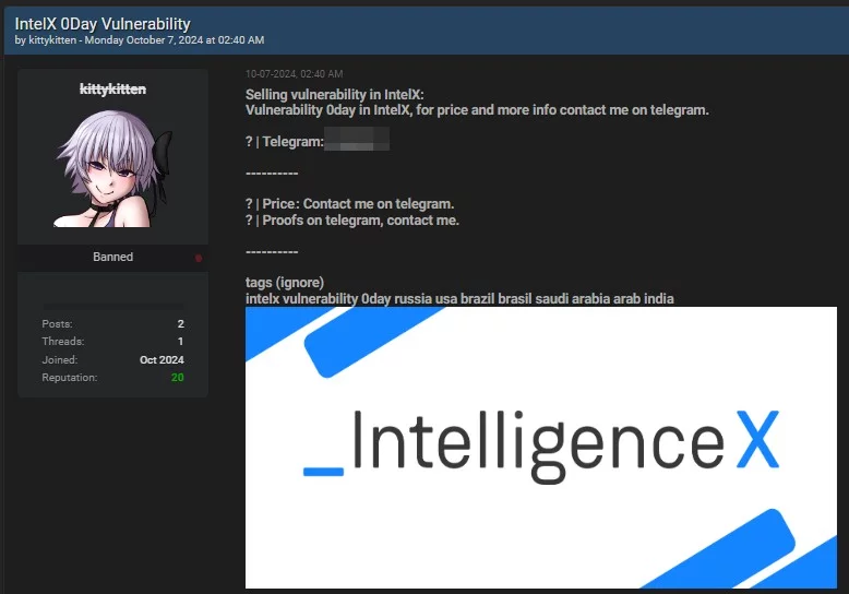 L’offerta della vulnerabilità è stata pubblicata il 7 ottobre 2024, alle 02:40 AM, con il titolo “IntelX 0Day Vulnerability”. Il venditore afferma di essere in possesso di una vulnerabilità che coinvolge IntelX e invita potenziali acquirenti a contattarlo tramite Telegram per ulteriori dettagli. Non vengono condivise ulteriori informazioni specifiche sulla vulnerabilità direttamente nel post, il che è comune in questi casi per evitare che altri possano sfruttare la vulnerabilità senza acquistarla.