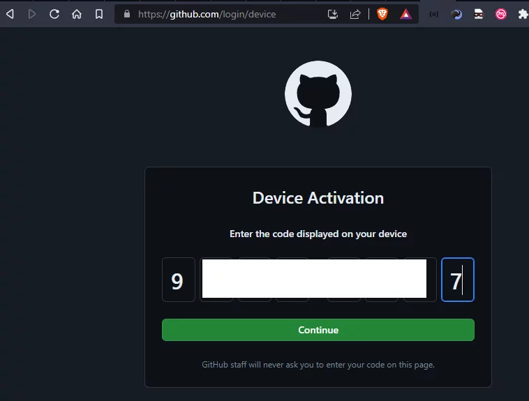 Ora apri il browser e visita https://github.com/login/device, effettua il login (se necessario) e inserisci il codice del dispositivo recuperato sopra: