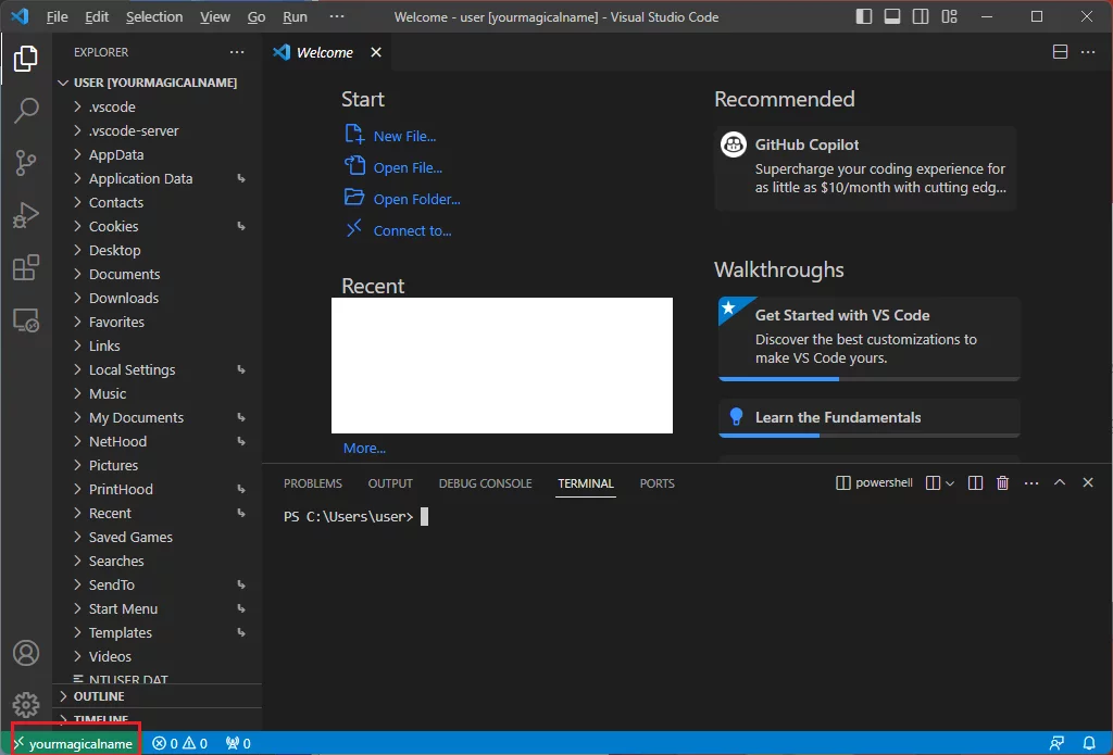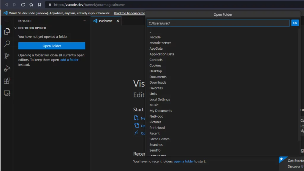 Al primo accesso la macchina scaricherà il server vscode appropriato e lo avvierà automaticamente. Dopo pochi secondi verremo accolti con un ambiente VSCode completamente funzionante tramite interfaccia web: