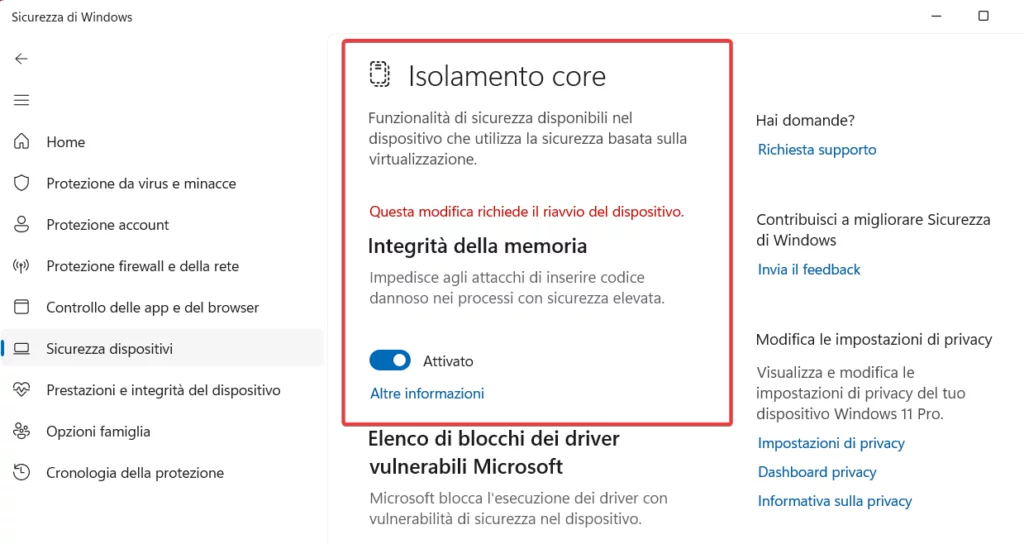 Tutti i computer Windows 11 che soddisfano i requisiti richiesti dovrebbero avere VBS abilitato per impostazione predefinita. Puoi verificarlo tramite Informazioni di sistema o tramite Sicurezza di Windows -> Sicurezza dispositivi -> Isolamento core, dove l’interruttore Integrità della memoria dovrebbe essere attivo.