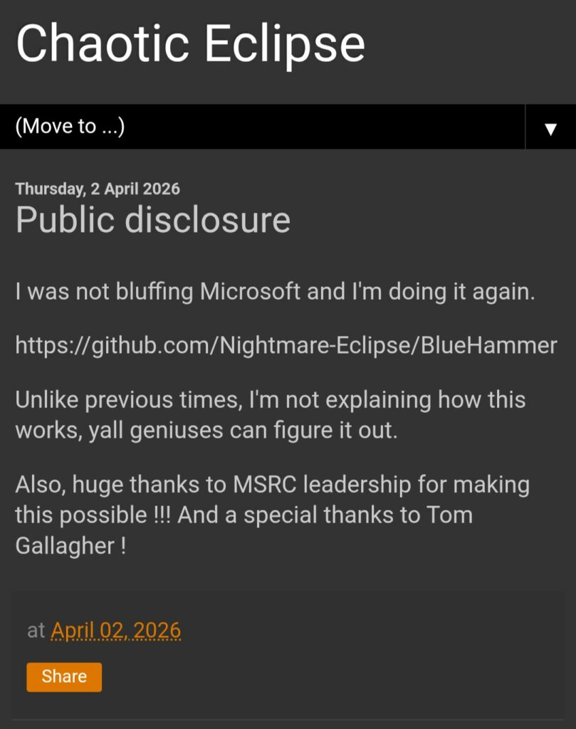 Agli inizi di aprile, Chaotic Eclipse ha pubblicato un repository di exploit su GitHub con il nickname Nightmare-Eclipse, esprimendo apertamente la sua irritazione per le azioni di Microsoft. Tuttavia, il ricercatore ha subito avvertito che il codice di prova conteneva bug che avrebbero potuto rendere l’exploit instabile.