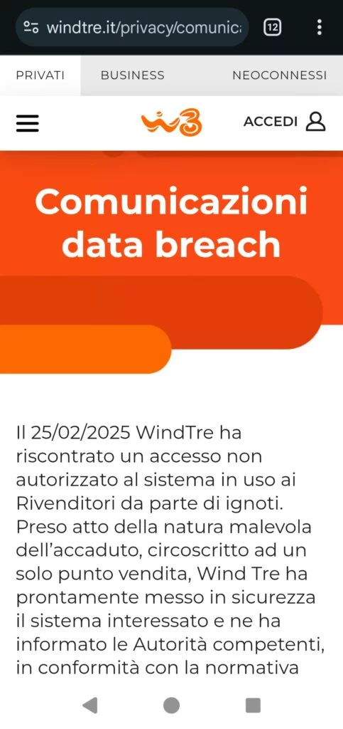 Il 25 febbraio 2025 WindTre ha rilevato un accesso non autorizzato ai sistemi informatici utilizzati dai propri rivenditori.