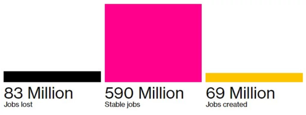 Nel sondaggio, circa il 75% delle 800 aziende ha dichiarato che avrebbe introdotto l’IA nel proprio lavoro nei prossimi 5 anni. Le organizzazioni stimano che l’integrazione dell’intelligenza artificiale porterà alla riduzione fino a 26 milioni di posti di lavoro, vale a dire dipendenti in posizioni amministrative e contabili, inclusi cassieri e contabili.