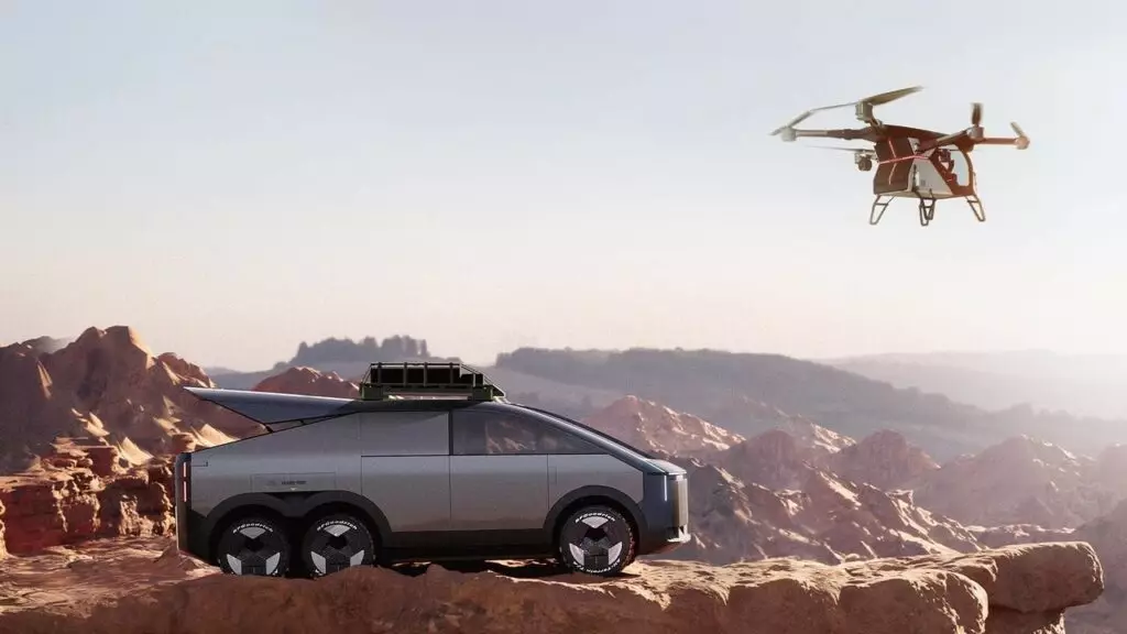 Il veicolo è progettato con una configurazione a tre assi e sei ruote, che consente la trazione integrale 6×6 e lo sterzo posteriore, offrendo una capacità di carico impressionante e capacità fuoristrada. Sebbene il design finale sia ancora in fase di sviluppo, vanta già un’estetica futuristica e cyber-meccanica, caratterizzata da linee nette e superfici lisce, che ricordano un “veicolo di esplorazione lunare”.