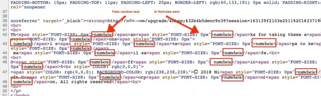 Quando il destinatario legge l’e-mail, tutto il testo con “FONT-SIZE: 0px” scompare, lasciando il testo che l’aggressore vuole che venga visualizzato.