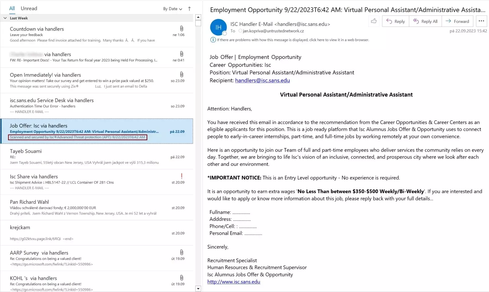 L’e-mail in questione mostrava un messaggio diverso nell’elenco e-mail di Outlook rispetto al riquadro di anteprima. Come puoi vedere di seguito, nel riquadro dell’elenco delle email viene visualizzato “Scanned and secured by Isc®Advanced Threat protection (APT): 9/22/2023T6:42 AM”, mentre l’inizio dell’email nel riquadro di anteprima/lettura visualizza “Lavoro Offerta | Opportunità di lavoro.”